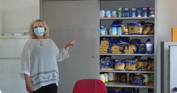 il sindaco Michela Rosetta mostra i prodotti alimentari conservati nel magazzino del municipio