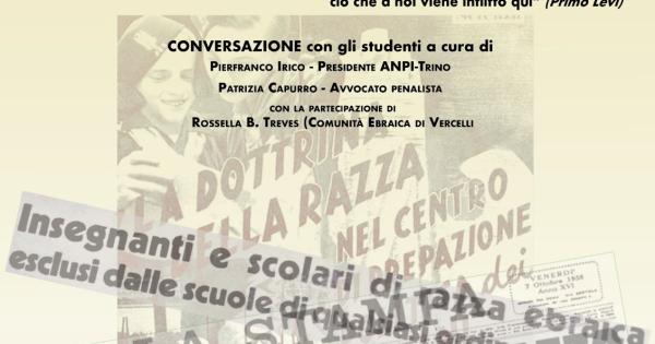 Iniziativa rivolta alle scuole superiori trinesi organizzata da Anpi, Comune di Trino e Comunità ebraica di Vercelli. Giovedì 17 novembre, alle ore 10, nel salone della biblioteca civica "Brunod" si terrà una conferenza-lezione sulle leggi razziali fasciste del 1938 con la presenza delle classi quinte dell'Istituto alberghiero "Sergio Ronco" e del Liceo artistico "Ambrogio Alciati". Titolo della lezione: "Le leggi. La razza - La forza del male. Fate di non subire nelle vostre case ciò che a noi viene inflitto qui (Primo Levi)". I relatori saranno la presidente della Comunità ebraica Rossella Bottini Treves, l'avv. Patrizia Capurro, con l'introduzione del presidente Anpi Pier Franco Irico.