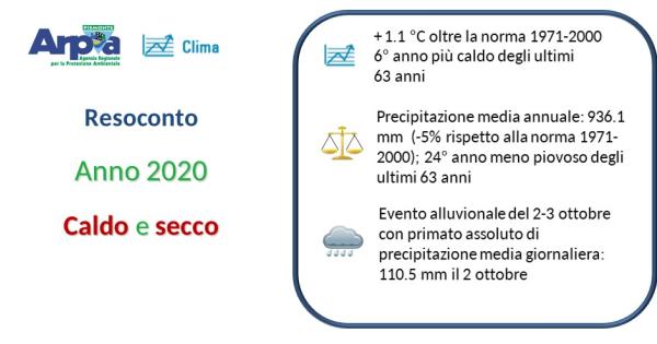 L’anno 2020 in Piemonte è stato il 6° più caldo degli ultimi 63 anni, con una temperatura media di circa 10.6°C ed un’anomalia termica media attorno a +1.1°C rispetto alla climatologia del periodo 1971-2000.