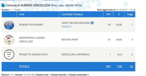 Nel Vercellese sono stati 21 i Comuni interessati al voto nella tornata delle amministrative del 3 e 4 ottobre: Albano, Arborio, Balmuccia, Boccioleto, Borgo d'Ale, Borgo Vercelli, Cravagliana, Fontanetto Po, Gattinara, Greggio, Lamporo, Lozzolo, Piode, Postua, Prarolo, Quinto, Rossa, San Germano, Santhià, Valduggia e Vocca.