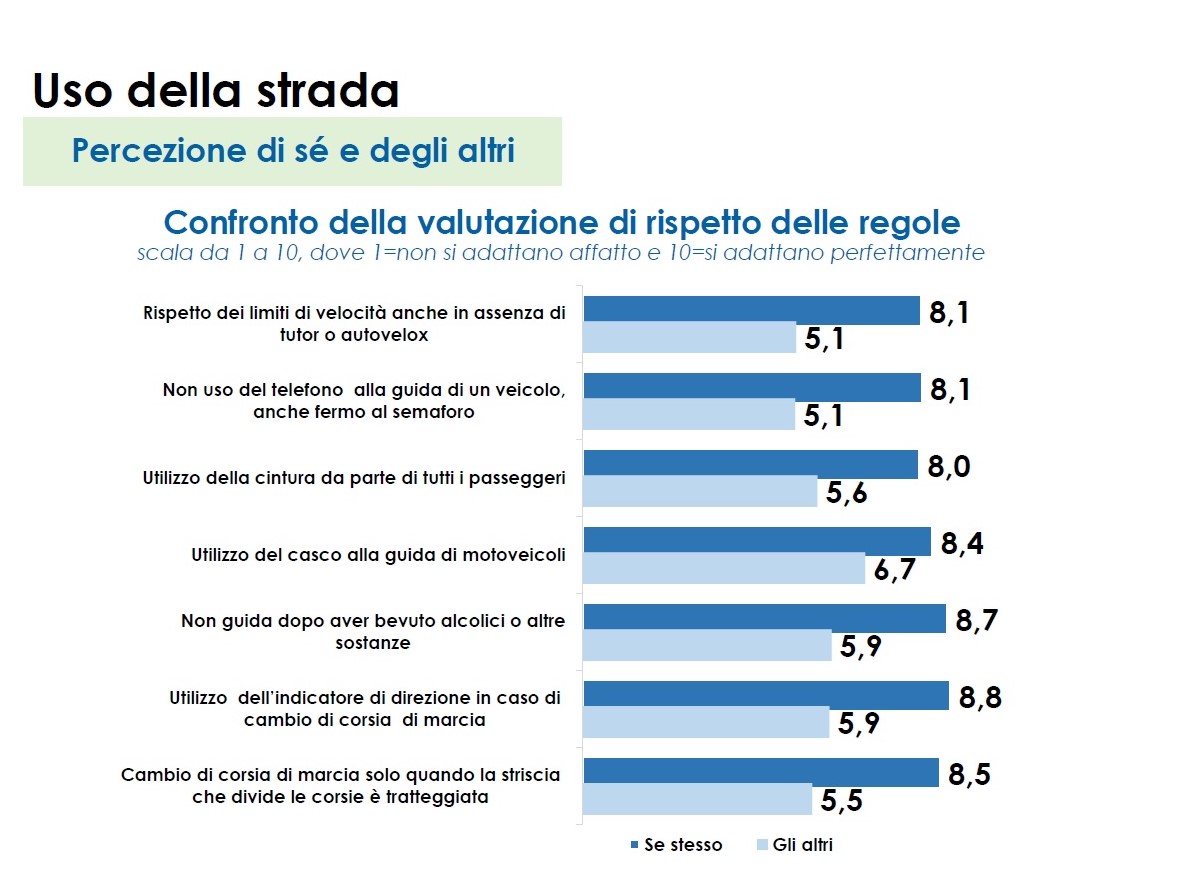 Nella percezione di sé e degli altri, mentre si è alla guida, si evidenzia una significativa discrepanza. Per quanto riguarda il rispetto delle regole del codice della strada, in una scala da 1 a 10, il giudizio su sé stessi oscilla tra un punteggio compreso tra l’8 e l’8,8. Decisamente meno clementi quando si esprime un giudizio sugli altri: qui la percezione raccoglie consensi che vanno da 5 a 5,9.