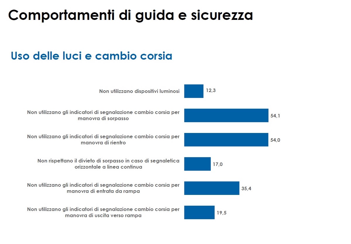 Maglia nera per il mancato uso delle frecce. Dalle osservazioni dirette su strada emerge, infatti, come il 54,1% dei conducenti non utilizzi gli indicatori di segnalazione per il cambio di corsia in fase di sorpasso. Percentuale analoga (54%) non li utilizza per segnalare il rientro dopo il sorpasso. I dati non sono più confortanti per altre tipologie di manovra: il 35,4% degli automobilisti non segnala l’ingresso in strada da rampa di accesso, mentre il 19,5% non indica l’uscita.