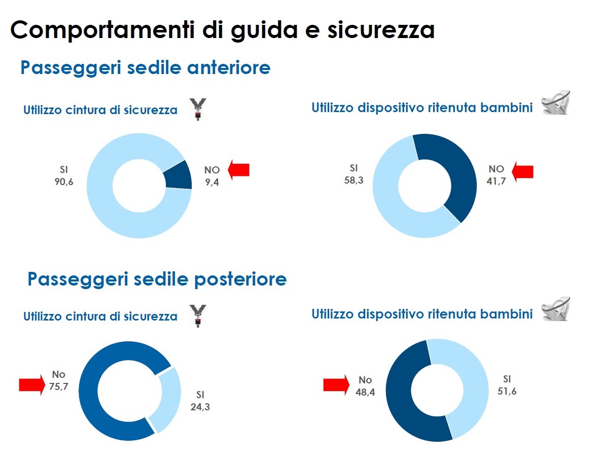 Mancato rispetto delle norme del codice della strada anche per quanto riguarda l’utilizzo dei dispositivi di ritenuta per bambini: il 41,7% non li utilizza sul lato anteriore della vettura, dato che peggiora se riferito al sedile posteriore dove la percentuale di chi non ne fa uso sale al 48,4%. Infine, il 10,3% dei conducenti usa impropriamente il telefono cellulare e l’11,4% non indossa la cintura di sicurezza, dato che aumenta vertiginosamente per i passeggeri sul sedile posteriore (75,7%).