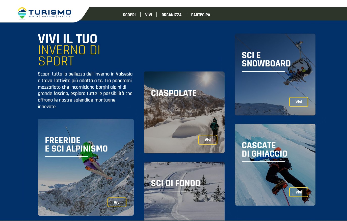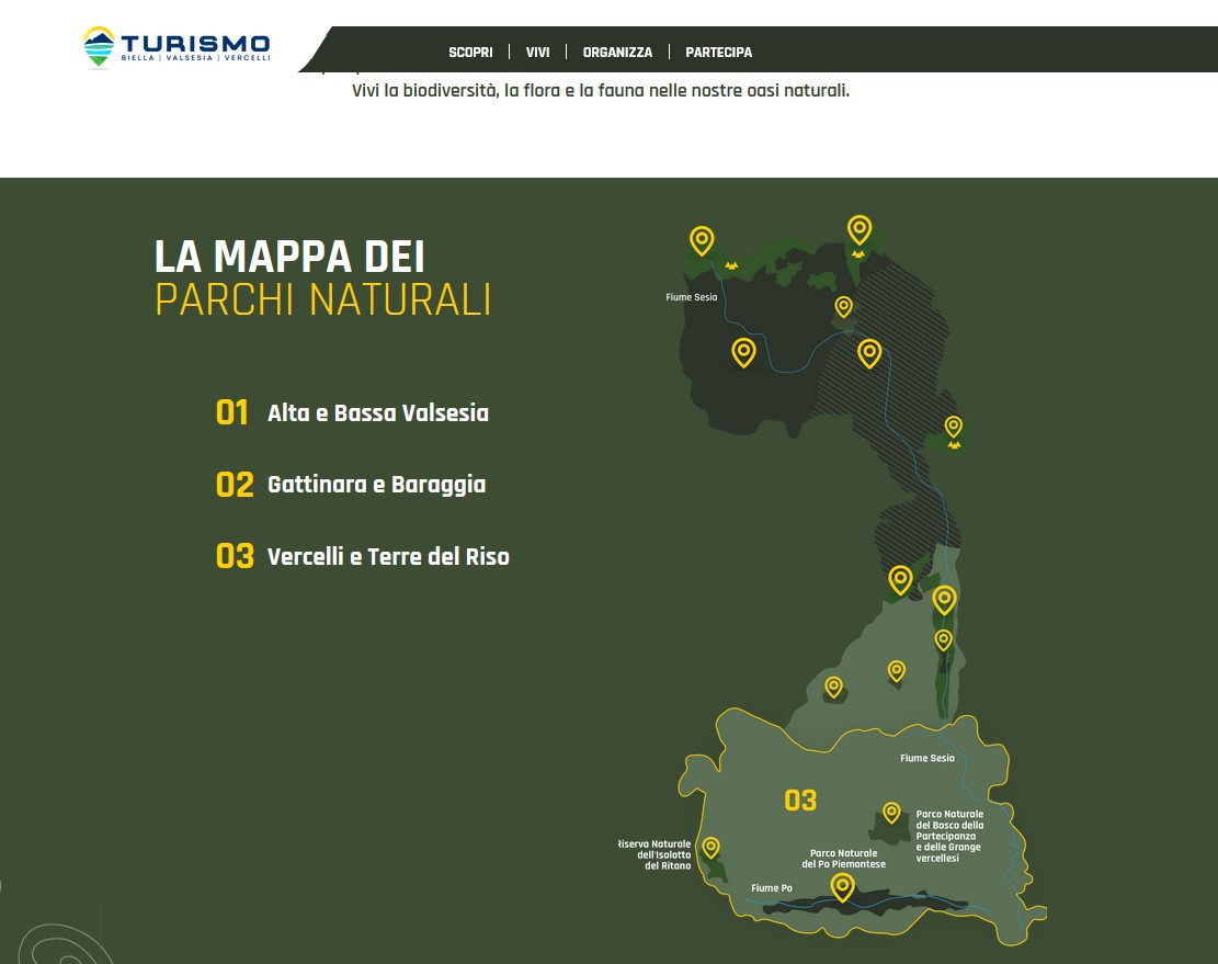 La struttura della homepage è semplice e efficace nel presentare gli highlights del territorio unitamente ad una mappa interattiva delle diverse aree in cui è suddiviso. Ci si concentra poi su un carosello di voci utili a pianificare nel migliore dei modi un soggiorno in provincia, seguito da una bacheca con le ultime news e gli eventi più importanti e, in ultimo, il socialwall della community di Atl. L’architettura del portale si articola in 4 sezioni: Scopri, Vivi, Organizza e Partecipa. La prima sezione offre una panoramica sulle aree del territorio, suddivise in “Alta Valsesia”, “Bassa Valsesia”, “Gattinara e Baraggia” e “Vercelli e Terre del riso”. A seguire, numerosi dettagli sul segmento neve legato alla Valsesia, su parchi, oasi naturali, siti Unesco e alcuni punti di interesse rappresentativi del territorio. Nuove, invece, le voci volte a presentare gli itinerari in provincia realizzati da Atl e già fruibili dal pubblico grazie alla collana di 12 brochure cartacee che sono qui disponibili per il download anche in versione digitale.
