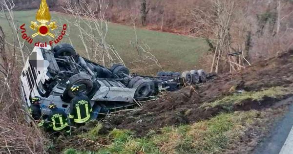 Autoarticolato esce di strada e si ribalta in una scarpata.