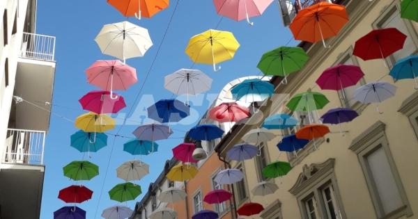 Via Dante con gli ombrelli colorati in vendita per beneficenza