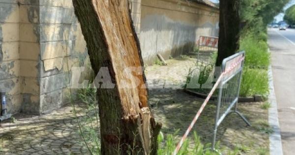 L'albero pericolante all'ingresso del cimitero Billiemme