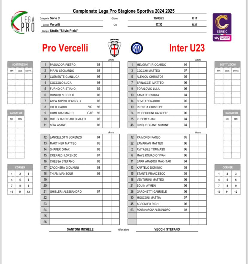 Una buona prova a metà per la Pro Vercelli nell’amichevole disputata il 10 agosto contro l’Inter U23, che con una sconfitta per 4 a 1 mette in dubbio tutte le certezze acquisite fino a questo momento.