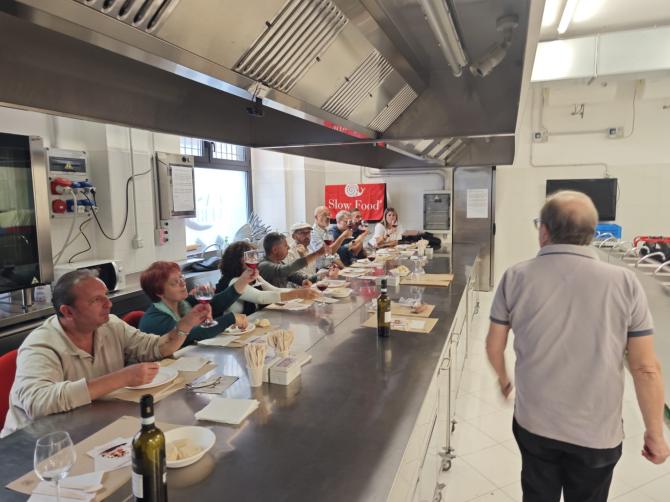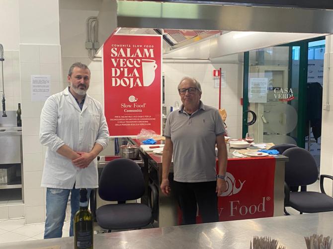 "Salam d'la Doja, parola al salumiere": nel secondo laboratorio dei Panissa Days, il pubblico di Casa Verdi ha scoperto i segreti del Salam d’la Doja, uno degli insaccati più rappresentativi della tradizione vercellese. Giovanni Binelli e Gabriele Varalda della Comunità Slow Food del Salam Vecc d’la Doja hanno illustrato la lavorazione di questo prodotto antico. Tra storia, tecniche artigianali e curiosità, i partecipanti hanno potuto apprezzare la passione e la maestria che rendono unico questo simbolo gastronomico del territorio.Non sono mancate le degustazioni di tre versioni: salame vercellese fresco, Salam Vecc d'la Doja fresco e Salam Vecc d'la Doja con oltre sei mesi di stagionatura.