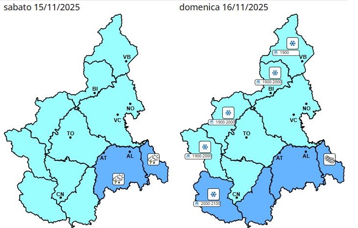 Sono le previsioni di Arpa Piemonte per il weekend: "Successivamente si avrà una pausa, seguita da una seconda fase piovosa, più intensa, nella giornata di domenica. In questo caso le precipitazioni saranno diffuse a tutta la regione, moderate e localmente forti sui settori meridionali tra le Alpi Marittime e l'Appennino, non si escludono locali rovesci di forte intensità. La quota neve sarà elevata, dai 2000-2200 m di questa notte, per poi scendere fino a 1800-2000 m di domenica. Ampie schiarite lunedì, con locale foehn", conclude Arpa Piemonte.