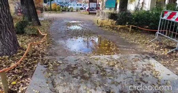 Passeggiata in viale Garibaldi a Vercelli tra pozzanghere e foglie che coprono tutto: dalle panchine ai tavolini dei bar, fino alle zone di passaggio riservate alle persone.