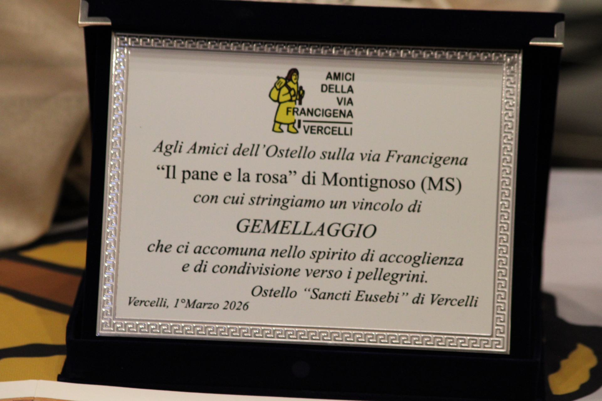 Nel corso della cerimonia è giunto il saluto istituzionale del Comune di Vercelli, che ha dato ufficialmente il benvenuto alla delegazione toscana, sottolineando come il gemellaggio rappresenti una continuità ideale con il lavoro portato avanti dall’associazione vercellese nel promuovere la Via Francigena come strumento di dialogo, crescita culturale e valorizzazione del territorio.