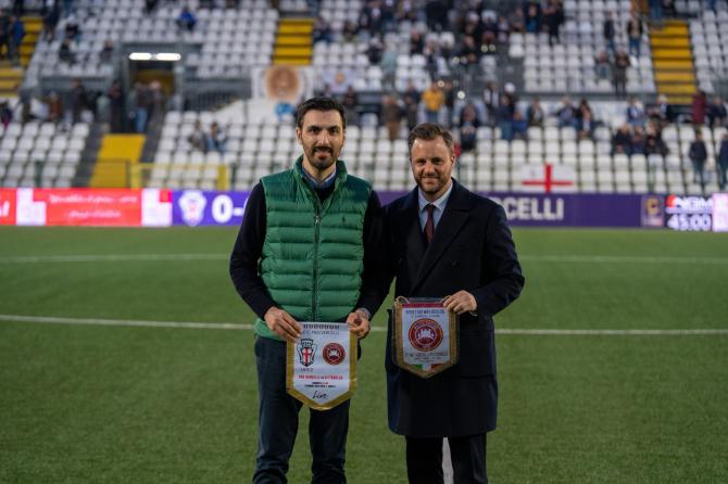 Durante la pausa, lo scambio dei gagliardetti tra i presidenti delle due società rinnova il legame di amicizia e fratellanza.