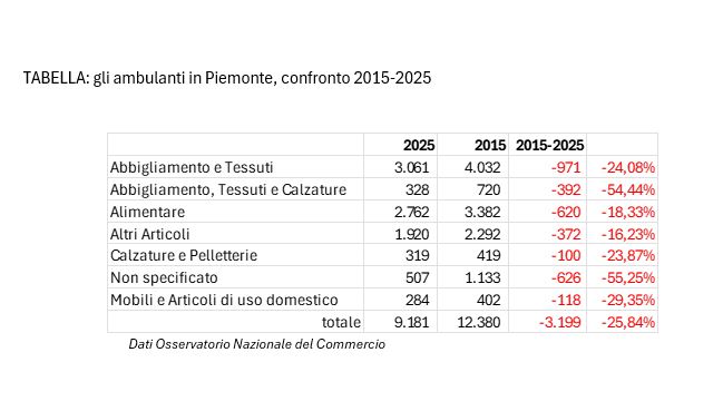 In Piemonte, negli ultimi dieci anni, il numero di ambulanti si è ridotto di quasi il 26%, con una contrazione che ha interessato tutti i settori.
