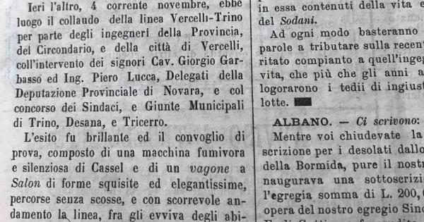 Il 18 ottobre muore l’ex sindaco Luigi Vega: ai funerali in tantissimi presenziano per ricordare la sua memoria. Il 4 dicembre, invece, viene inaugurata la linea di tramways Vercelli-Trino. Ideata dagli ingegneri della Provincia. Dopo la prima tratta, durata 38 minuti comprese le fermate di Trino e Desana, l’esito è brillante: il mezzo è composto da una macchina funivora e da un vagone “dalle forme squisite ed elegantissime”. Il passaggio del tramway viene accolto dal saluto degli abitanti dei paesi nei quali transita.