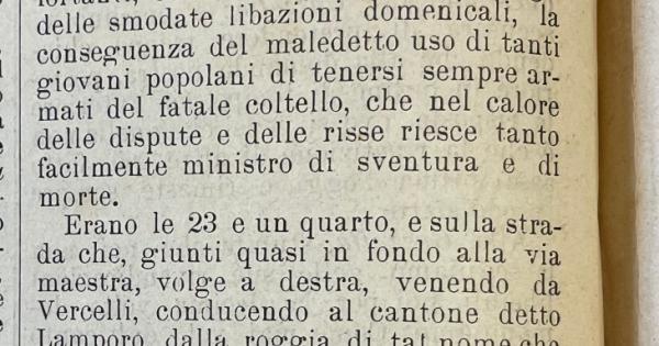 Il 25 febbraio Vercelli viene scossa da una terribile tragedia: un giovane cremonese, Agostino Palavera, viene sbranato da un leone, presente nel serraglio del signor Romano Laure. Palavera, da appena due giorni assunto come garzone al servizio di Laure, entra nella gabbia del feroce animale, contro il divieto che gli era stato imposto nei giorni precedenti. La scena che i soccorritori si trovano davanti è raccapricciante: “il fiero animale si scagliò contro l’imprudente giovane, lo atterrò, e con le unghie poderose ne fece strazio, lacerandogli il collo così, da staccargli quasi il capo dal busto”. Nelle ore seguenti si sparge la voce che il leone sia scappato dalla sua gabbia, creando un panico enorme nella cittadinanza: fortunatamente la notizia viene subito smentita e la tranquillità torna tra gli abitanti.