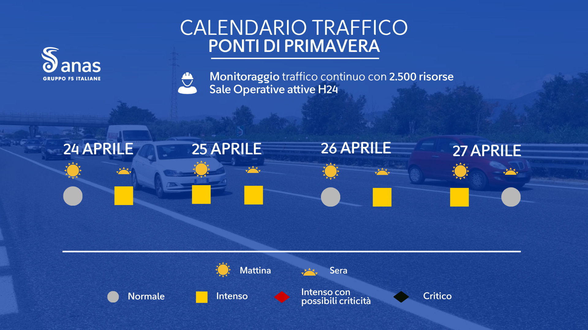 “Nel corso del maxi ponte di primavera, Anas – ha dichiarato l’amministratore delegato di Anas Claudio Andrea Gemme – aumenterà la sorveglianza e verrà garantita la presenza ininterrotta del personale con 2500 risorse in turnazione, personale tecnico e di esercizio, e oltre 200 unità nelle Sale Operative Territoriali e la Sala Situazioni Nazionale per assicurare il monitoraggio del traffico in tempo reale h24. Al nostro quotidiano lavoro – ha sottolineato l’Ad Gemme – aggiungiamo l’invito a tutti gli utenti della strada di guidare sempre nel rispetto del Codice della Strada e senza distrazioni per un viaggio sereno e sicuro”.