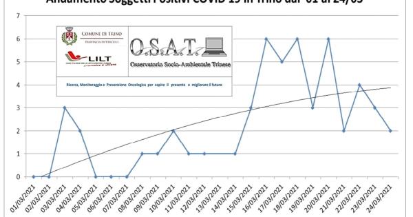 Curva dei contagi da Covid-19 ancora in crescita a Trino ma con tendenza all’appiattimento, da confermare, e poi, si spera, dovrebbe arrivare la riduzione dei casi. A Trino sono 47 i positivi all’aggiornamento di mercoledì sera. Prosegue il monitoraggio sull’andamento della pandemia Covid-19 in città da parte dell’Osservatorio socio ambientale trinese (Osat) grazie al lavoro dell’epidemiologo dottor Christian Salerno.