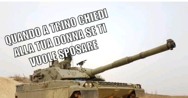 Il post ovviamente non ha sopito del tutto le polemiche, c’è chi è rimasto sulla propria posizione, c’è chi ha cambiato idea, c’è chi invoca sanzioni, e poi c’è Roberto Boscolo, già altre volte autore di post esilaranti, sarcastici, divertenti, che l’ha messa sul ridere per stemperare gli animi: la foto di un carro armato con la frase “quando a Trino chiedi alla tua donna se ti vuole sposare”. Un successo come sempre, da numero uno. Fantastico. E a proposito di carri armati e cannoni, botti e fuochi, per sopire gli animi potrebbe essere utile accettare il famosissimo invito de I Giganti nella canzone “Proposta”, del 1967, che nel suo ritornello afferma “Mettete dei fiori nei vostri cannoni perché non vogliamo mai nel cielo molecole malate, ma note musicali che formino gli accordi per una ballata di pace, di pace, di pace tam, tam, tam”.