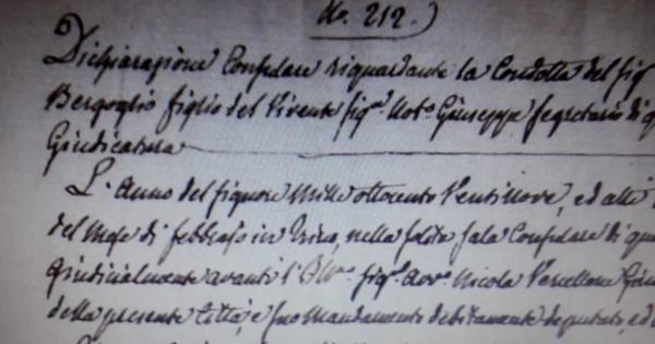 "Il verbale 212 del 3 febbraio 1829 ha come titolo “Dichiarazione consulare riguardante la condotta del signor Vincenzo Bergoglio figlio del vivente signor notaio Giuseppe, segretario di questa Regia Giudicatura”. Vincenzo figlio aveva forse bisogno di una dichiarazione di buona condotta per partecipare a qualche concorso o a una eventuale promozione? Il verbale non lo specifica, resta questo impegno del sindaco e dei consiglieri comunali di valutare la condotta di questo giovane Bergoglio. E’ interessante anche la lettura di questo atto che ci fa capire come si organizzava una seduta di Consiglio, chi partecipava e come veniva vergato il verbale dal segretario comunale, a quel tempo Pietro Ara, importante famiglia trinese".
