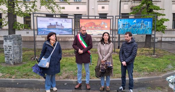 Erano presenti Marina Gallarate, presidente del Comitato del Gemellaggio, con la consigliera Valerie Piot, il sindaco Daniele Pane con gli assessori Silvia Cottali e Alberto Mocca, i ragazzi del liceo artistico “Ambrogio Alciati” accompagnati dal professor Ugo Iovino, e una delegazione dell’alberghiero “Sergio Ronco”. Inaugurazione sotto la pioggia di uno dei primi temporali di stagione, ma comunque bella e significativa con i saluti e i commenti da parte degli amministratori comunali e la sottolineatura da parte della Gallarate del significato del gemellaggio, della partecipazione degli studenti, che ha ringraziato per aver partecipato alla lavorazione di questi pannelli. Alla fine sono state scelte le rappresentazioni dello studente Aleister Battezzato, la cui grafica è stata realizzata in occasione del progetto "Fa-Rete - La coperta della solidarietà" con il Comitato Gemellaggio di Trino, finanziato da Regione Piemonte e cofinanziato dal Comune di Trino.
