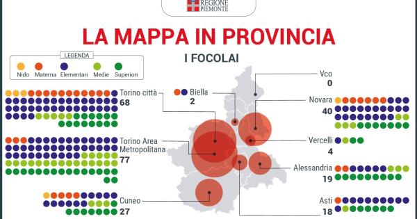 Dal monitoraggio condotto dalla Regione Piemonte, nella settimana dal 20 al 26 dicembre, la situazione del contagio nelle scuole registra un aumento dei focolai e delle quarantene, seppur contenuto rispetto alla totalità delle classi scolastiche presenti sul territorio piemontese. Nel dettaglio, i focolai passano da 172 a 255: 5 nei nidi (età 0-2 anni), 28 nelle scuole dell’infanzia (3-5 anni), 121 nelle scuole primarie (6-10 anni), 38 nelle scuole secondarie di 1°grado (11-13 anni), 63 nelle scuole superiori (14-18 anni). Suddivisi su base provinciale: 19 Alessandria (2 infanzia, 5 primarie, 3 medie, 9 superiori), 18 Asti (1 infanzia, 10 primarie, 1 media, 6 superiori), 2 Biella (1 infanzia, 1 primaria), 27 Cuneo (1 nido, 4 infanzia, 11 primarie, 3 medie, 8 superiori), 40 Novara (1 nido, 6 infanzia, 21 primarie, 5 medie, 7 superiori), 68 Torino città (3 nidi, 11 infanzia, 35 primarie, 5 medie, 14 superiori), 77 Torino città metropolitana (3 infanzia, 37 primarie, 20 medie, 17 superiori), 4 Vercelli (1 primaria, 1 media, 2 superiori), nessuno nel Vco.