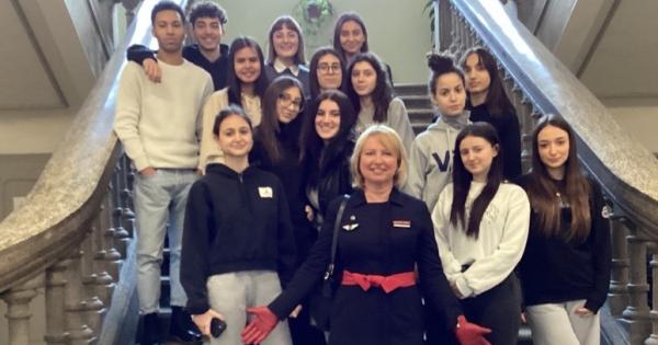 Le lingue sono fondamentali per chi vuole intraprendere questa carriera-aggiunge ancora la nostra ospite-ma molto dipende dal modo di porsi. Gli studenti ascoltano, chiedono, sorridono, intervengono, forse un po’ sognano, e la nostra assistente di volo è prodiga di informazioni, consigli, incoraggiamenti. Sempre con il sorriso di chi la sa davvero lunga ma non lo fa pesare nemmeno per un istante. “Tentate!” -dice loro. Voli pindarici? Sì, forse, ma “non bisogna aver timore”- aggiunge ancora. Di spiccare il volo? (ndr). Messico, Guinea Equatoriale, Panama, Parigi, Uagadou: allacciate le cinture! E dopo il giro del mondo…foto di gruppo sullo storico scalone del Cavour. Buon viaggio, ragazzi: destinazione futuro. Buon lavoro, Beata! Torna presto a trovarci!