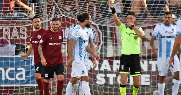 Giuseppe Collu, arbitro della sezione di Cagliari, mentre mostra il cartellino giallo