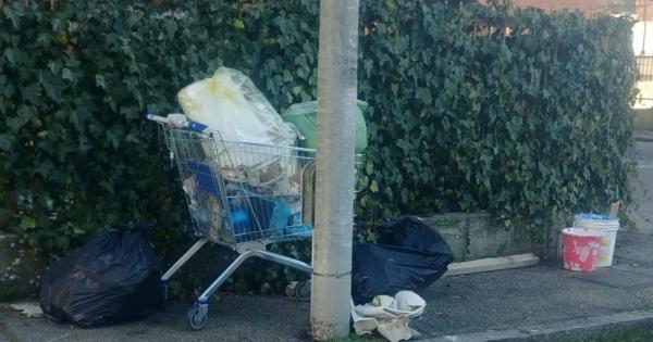 Se lo chiede un lettore che invia uno scatto esplicativo: un carrello della spesa strapieno di rifiuti che impedisce il passaggio sul marciapiede, oltre a sacchetti e secchi di vernice vuoti abbandonati.