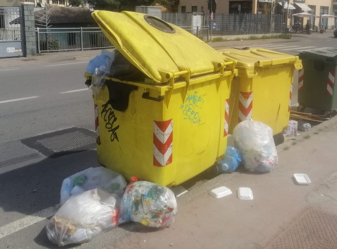 La segnalazione arriva da un lettore, che con i suoi scatti illustra la situazione del marciapiede che costeggia la strada, disseminato di rifiuti che straripano dai contenitori.