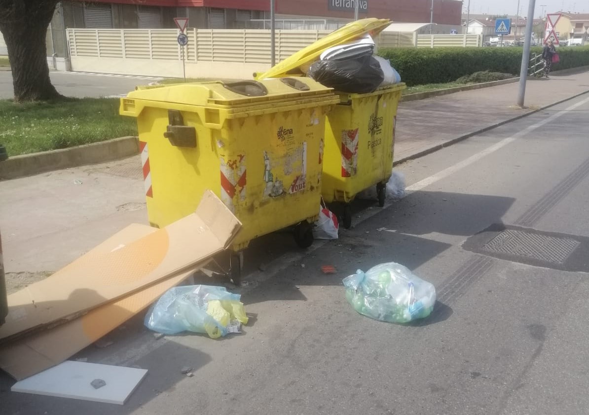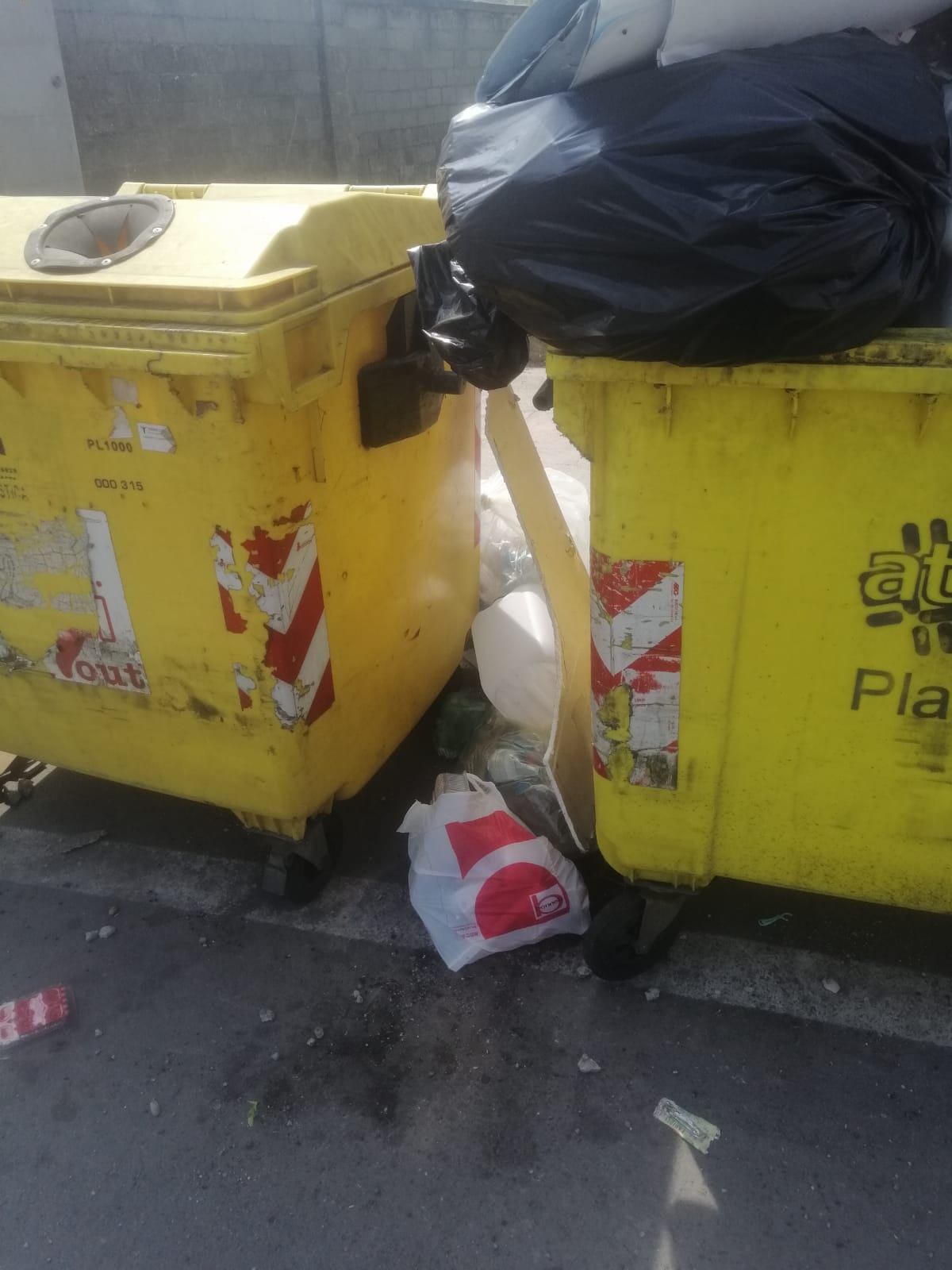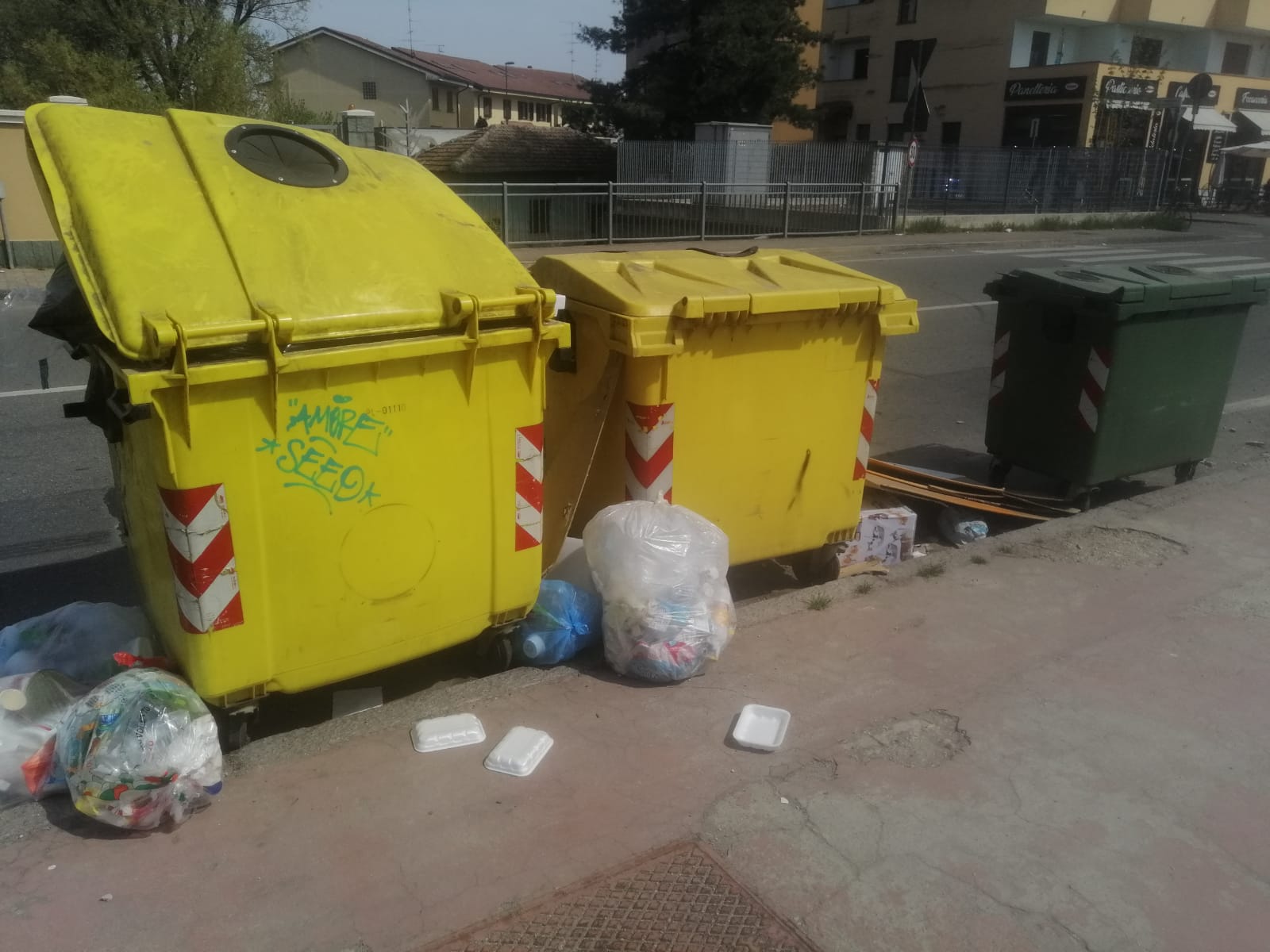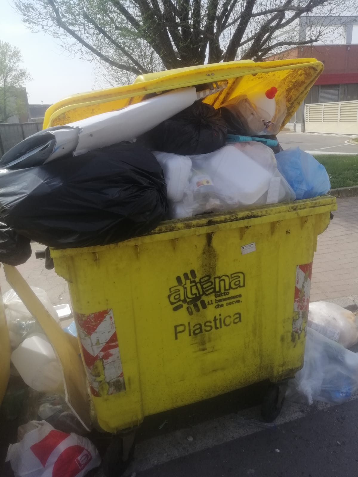 "Vercelli, via Walter Manzone, questo è lo stato dei contenitori per la raccolta della plastica".