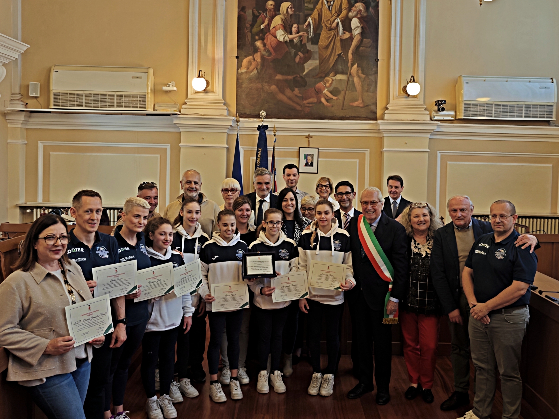Le campionesse Giulia Perotti, Alessia Daniello, Margherita Casalino, Artemisia Iorfino e Thelma Lapalombella hanno ricevuto l’attestato dalle mani del sindaco. Il presidente Casalino ha invece ritirato il riconoscimento per Elena Ferrari ed Elena Colas.