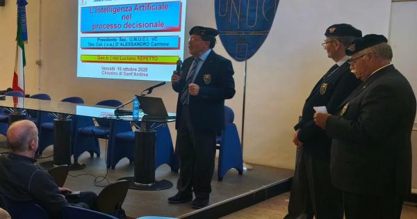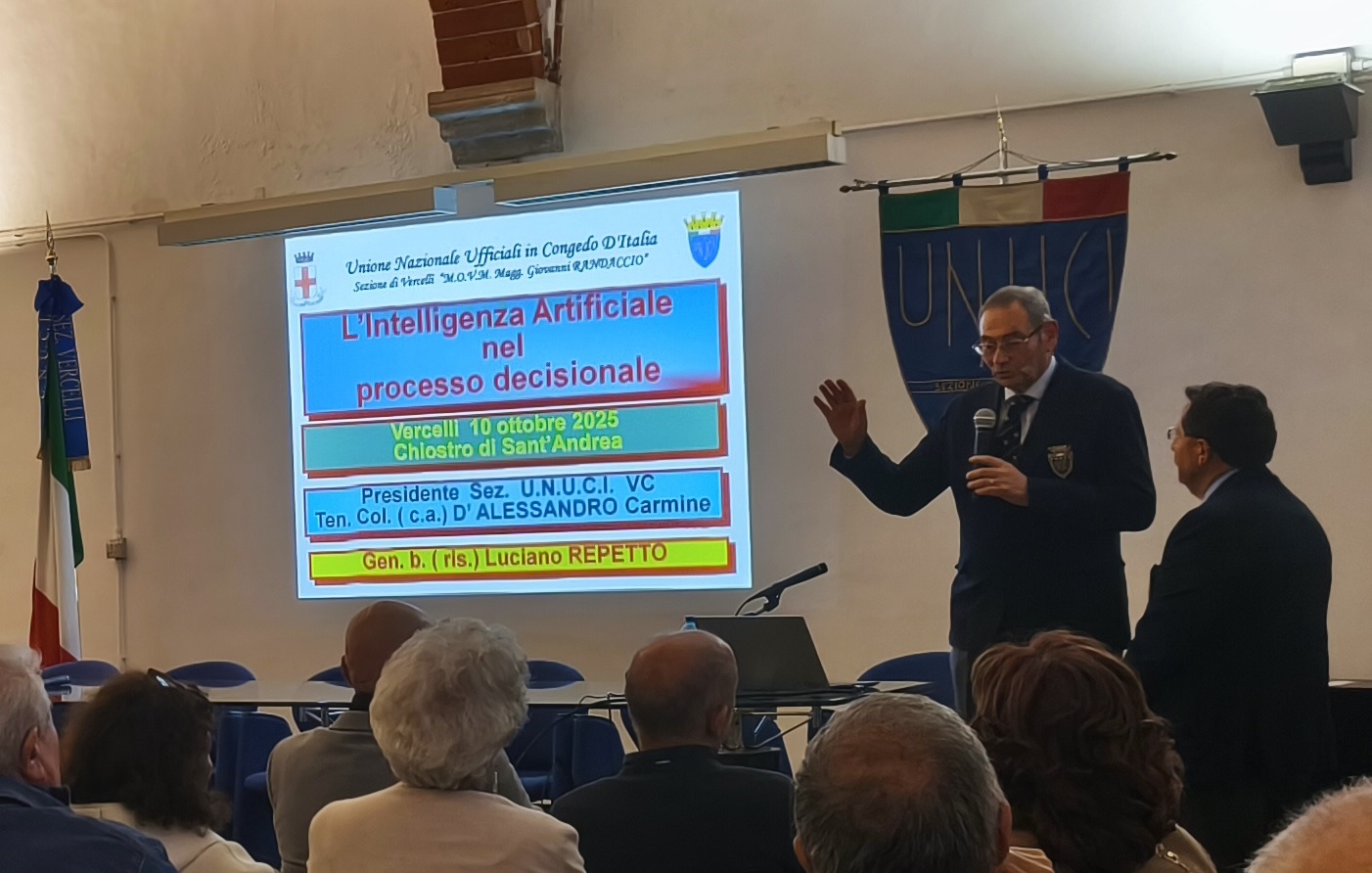 Dopo un breve indirizzo di saluto ed i ringraziamenti di rito da parte del Presidente della Sezione, Ten. Col. (c.a.) Carmine D'Alessandro, è seguita una breve presentazione del relatore Gen. B. (c.a.) Luciano Repetto dell'U.N.U.C.I. Genova, che ha trattato il tema “L'Intelligenza Artificiale nel processo decisionale”.