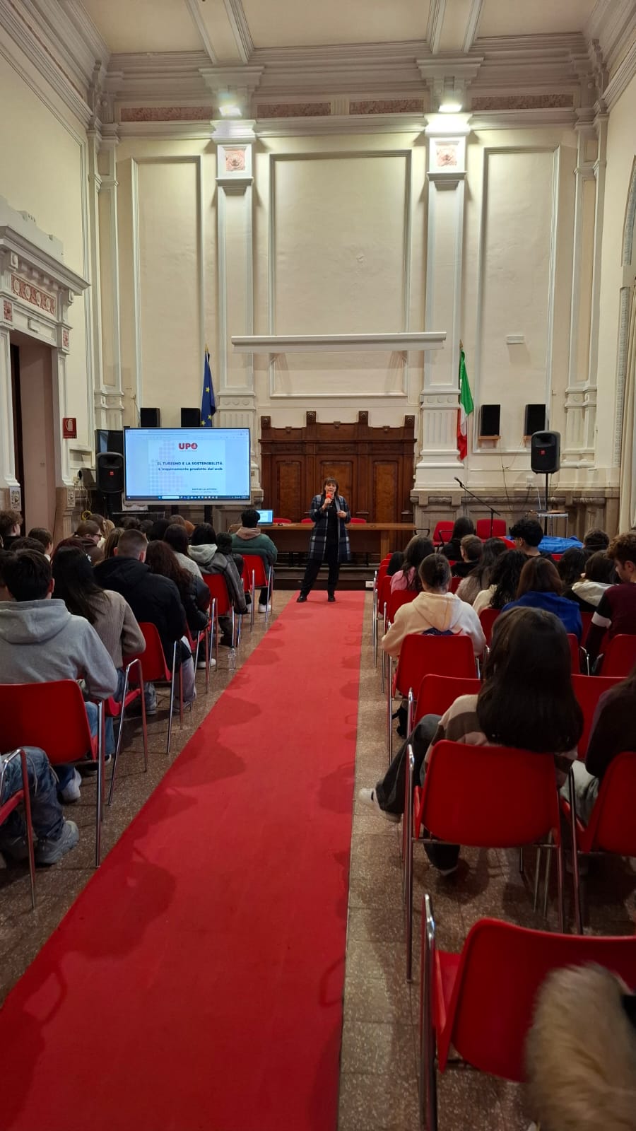 A guidare l’incontro è stata la professoressa Raffaella Afferni, docente dell’Università del Piemonte Orientale, che davanti alle classi 5^D TUR., 4^I TUR. e 3^I TUR. ha messo ordine in una materia spesso evocata e raramente capita: la sostenibilità, applicata al turismo e al digitale.