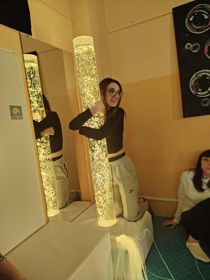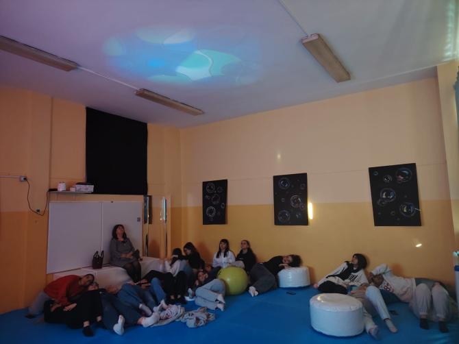 È proprio nell’aula multisensoriale,   visitata dalle alunne, che è possibile sperimentare esperienze che stimolano i cinque sensi. In particolare ci si avvale di materiali e strumenti specifici;  per la stimolazione della vista si usano fibre ottiche, tubi a bolle, proiettori di immagini liquide; per sollecitare il senso dell’udito vengono ascoltati musica rilassante, suoni della natura, rumori bianchi; il tatto  invece verrà stimolato da pareti tattili, cuscini vibranti, palline di varie grandezze e consistenze con lo scopo di aumentare la propriocezione dell’utente; infine l’olfatto può essere coinvolto attraverso l’uso di diffusori con varie fragranze.