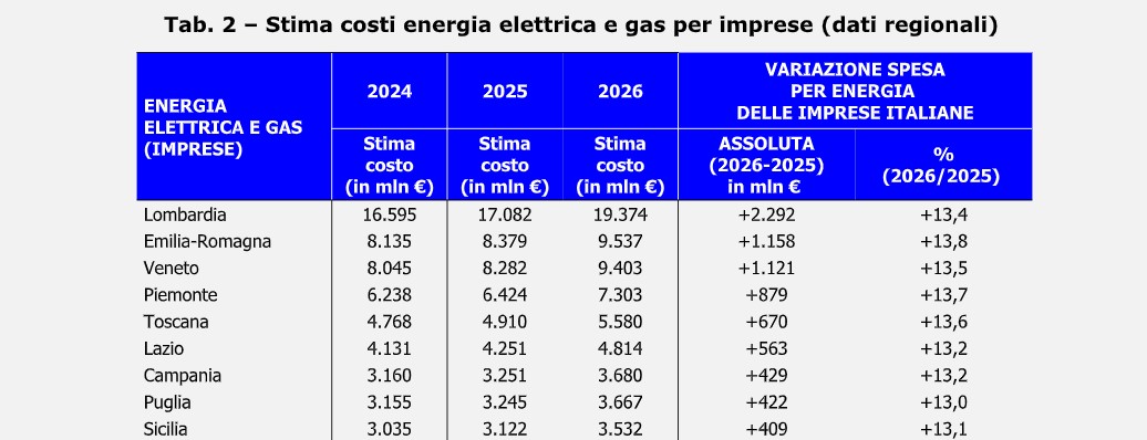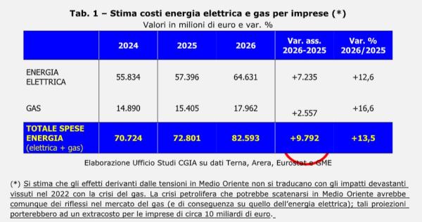 A pesare è soprattutto l’impennata dei prezzi di gas ed energia elettrica registrata negli ultimi giorni. Se le attuali tensioni dovessero tradursi in rincari strutturali dei costi energetici, le aziende italiane potrebbero trovarsi a pagare quest’anno 7,2 miliardi di euro in più per l’elettricità e altri 2,6 miliardi per il gas. Una variazione percentuale rispetto al 2025 del +13,5.