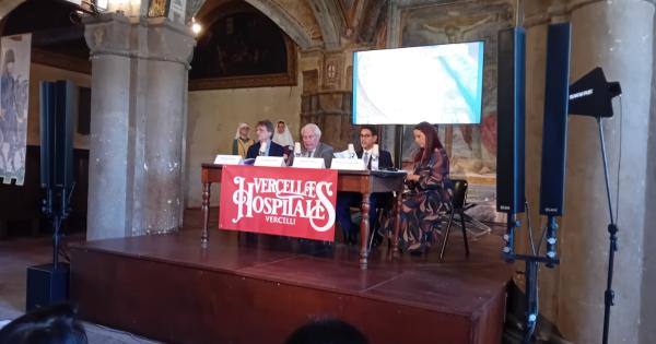 Conferenze, rievocazioni, mostre, incontri, culturali e divulgativi: sono 75 gli appuntamenti, gratuiti, che Vercelli proporrà in occasione della 3ª edizione di Vercellae Hospitales, iniziativa realizzata dal Comune in collaborazione con il Salone Internazionale del Libro di Torino e con il Festival del Libro Medievale di Saluzzo. La manifestazione, prima in Piemonte ad aver ricevuto il patrocinio degli 800 anni dalla morte di San Francesco d’Assisi, è in programma dal 10 al 19 aprile. Gli incontri gratuiti con gli autori stanno infatti registrando un numero di prenotazioni molto elevato: la conferenza dello storico Franco Cardini, che si terrà mercoledì 15 aprile nella basilica di Sant’Andrea alle 21, ha già registrato 250 adesioni, mentre l’appuntamento con lo psichiatra e saggista Vittorino Andreoli, domenica 19 aprile alle 16 nella Cripta, si avvicina al tutto esaurito, confermando l’attenzione del pubblico verso i temi culturali proposti dalla rassegna. Questi due appuntamenti avranno anche la traduzione simultanea nella lingua dei segni. "La Cultura deve essere di tutti. Non di pochi. Non di chi ha più strumenti. Non di chi ha più facilità. Di tutti. E quando diciamo “di tutti”, dobbiamo dimostrarlo con i fatti - ha sottolineato il sindaco Roberto Scheda in occasione della presentazione -. Il dettaglio della traduzione simultanea con la lingua dei segni potrebbe sembrare tecnico, in realtà racconta molto di quello che vogliamo costruire". Questa è la differenza tra fare cultura per pochi e costruire una comunità culturale". Con il sindaco anche il vice Domenico Sabatino, Il vice direttore del Salone Internazionale del Libro di Torino Marco Pautasso ed Emanuela Bobba di BFP eventi.